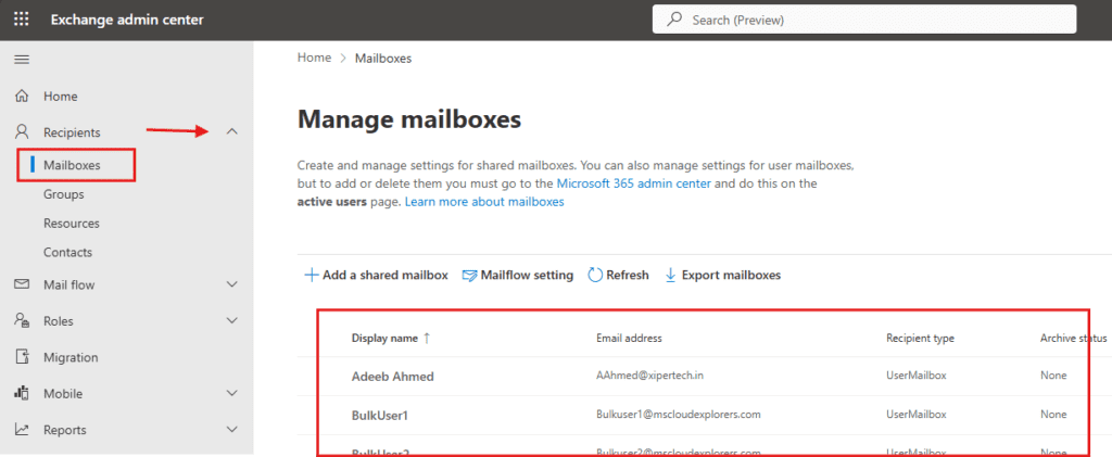 Exchange Admin → Mailboxes