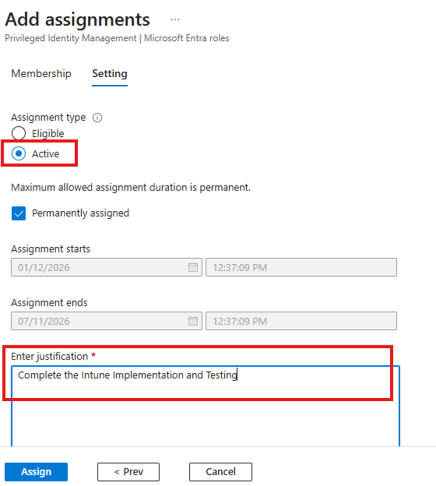Note: Active assignments grant permanent access and should be used only when absolutely necessary.