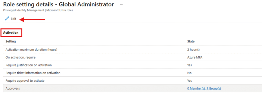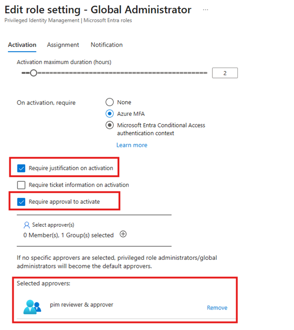 For high-privileged roles such as Global Administrator or SharePoint Administrator, you should configure activation to require approval. This ensures an additional security checkpoint before elevated access is granted.