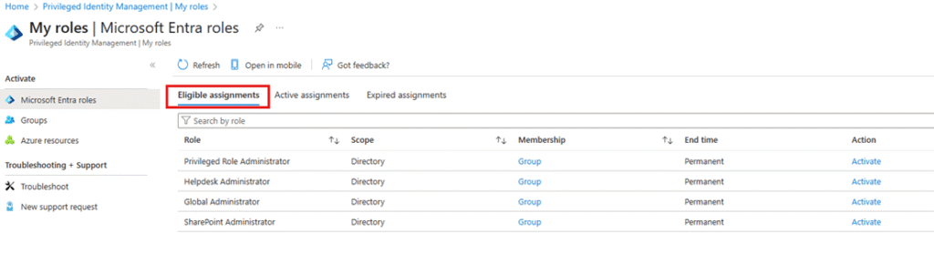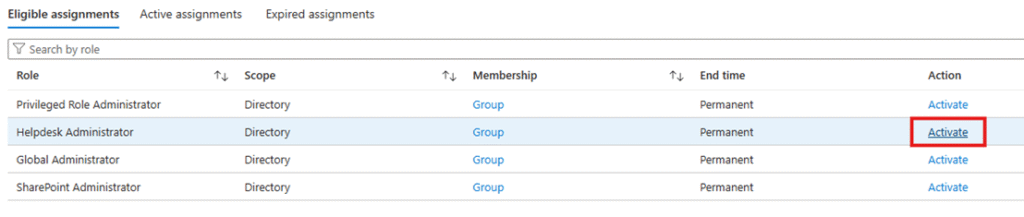 Under Eligible assignments, you will see the roles available for activation.