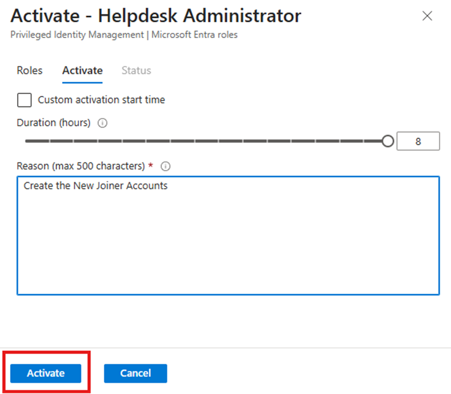 - In the activation window, provide a justification and click Activate.