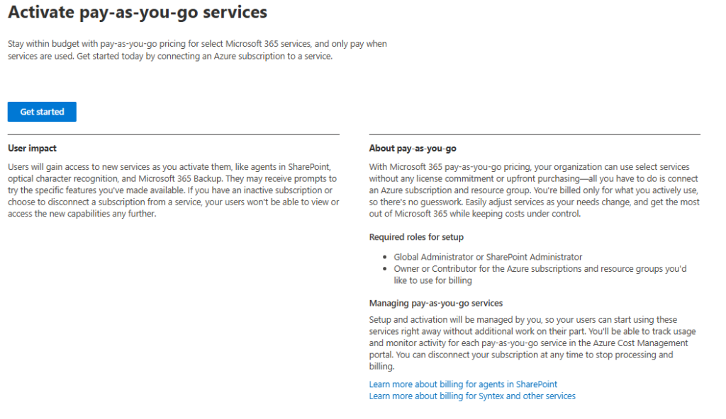 • Select the Get Started in the Activate pay-as-you-go Service page